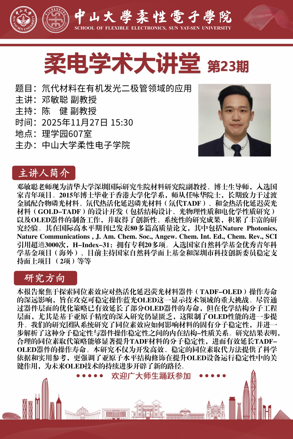 导航痕迹 中山大学柔性电子学院 学科科研 学术讲座 柔电学术大讲堂第23期:氘代材料在有机发光二极管领域的应用 扫描此二维码分享 柔电学术大讲堂第23期:氘代材料在有机发光二极管领域的应用 发布人:谢添 发布日期:2025-11-25