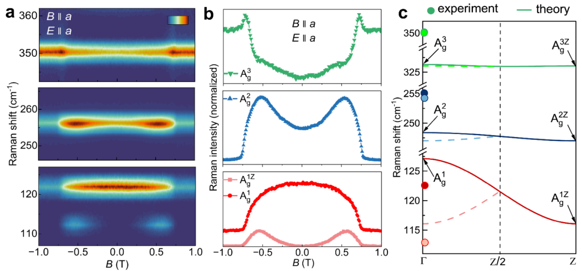 当磁场沿a轴施加时,CrSBr进入一种特殊的“自旋倾斜态”——原子的磁矩不再完全平行或反平行,而是形成一个夹角。在这一状态下,拉曼光谱中突然出现了三个全新的振动峰。理论分析表明,这些新峰是原本位于布里渊区边界的声子模式,因磁序改变而被“折叠”到了可观测的Γ点。换句话说,磁序改变了晶格的对称性,让原本“隐身”的振动模式得以现身。