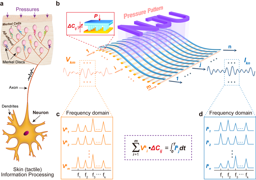 面向可穿戴设备和具身智能系统对大规模触觉信息获取和处理的实时性与吞吐量要求,研究团队受人类皮肤中的触觉感受器的结构与机制启发,提出在近传感端和模拟域内直接实现全阵列高并行度触觉信息读取与处理新范式(如图1所示)。该方案利用频分复用技术,基于平行板电容器基本物理模型和基尔霍夫电流/电压定律,通过给阵列每行加载多频交流模拟信号,在加载应力图案的同时并行完成全幅触觉信息的读取与处理,并将结果体现在列输出信号的频谱特征中,颠覆了传统触觉传感器的串行读出和处理模式。在数学上,该处理过程等价于变换矩阵(输入交流电压信号的频谱)与应力图样矩阵(施加应力图样后各器件的电容变化量)的乘法,当变换矩阵为单位矩阵时,即执行并行读出功能。该方案不仅大幅减少了触觉图样的读取和处理时间,同时对于一个N×N的阵列,传统方式要实现全阵列并行读取和处理,需要N×N个端口数,而本方案仅需要2N个端口数即可实现全阵列并行处理,大幅降低了阵列的布局布线复杂度。在阵列规模增加情况下,本方案带来的延时和布线优势还将更加显著,从而为大面积、高分辨率、高吞吐量、低延时电子皮肤的设计与实现提供了全新的理论视角和工程途径。