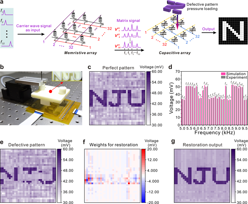在硬件实现方面,研究团队制备了柔性32×32规模电容式触觉传感阵列,并对各器件进行了系统性的应力测试和表征(如图2所示)。测试结果展现出宽动态、高耐久性和均匀性的特点,为电子皮肤系统的构建提供了硬件条件。在此基础上,研究团队将柔性电容式触觉传感阵列与同等规模的柔性忆阻阵列级联,搭建了高并行度柔性电子皮肤原型系统(如图3所示)。在实验上验证了该系统对NJU应力图样的高并行度全阵列一次性读取功能。进一步地,研究团队利用特定的变换矩阵,并将矩阵映射为忆阻器阵列的电导权重,通过多频交流信号作为载波输入,实现了对残破的NJU应力图样的一次性并行修复与重建功能验证。在更换其他类似应力图案时,只需微调忆阻器阵列中的少量电导权重,即可完成修复,展示了高并行度皮肤拟态感内计算架构对触觉图样信息的高效读取与处理能力。