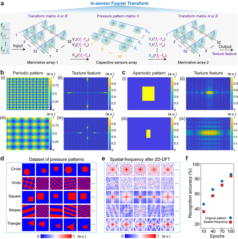 研究团队进一步构建由两个忆阻器阵列与电容式传感阵列级联组成的电子皮肤系统,在近传感端实现复杂触觉图样信息的压缩、特征提取和模式识别功能的原理性验证(如图4所示)。该方案同样基于频分复用思路,将两个矩阵相乘拓展到三个矩阵相乘,实现高并行度二维离散傅里叶变换,将空间域应力图样转化为频域,实现纹理特征的高效提取。研究团队对周期性应力图样和非周期性应力图样分别进行了变换处理,与原始空间域相比,变换后的频域平面具有稀疏性的特点,在大幅降低数据量、减少数据冗余的同时,仍然能够保留关键特征信息用于应力模式识别。通过构建同时包含周期性图样和非周期性图样的数据集,进行神经网络训练和测试表明,基于频域特征的识别准确率能够达到与基于原始应力图样识别准确率相当的水平。本工作提出的高并行度皮肤拟态计算范式和原型系统,为大面积、高分辨触觉信息的一次性读取和处理提供了启发性思路,也为具身智能机器人灵巧手和新一代电子皮肤的设计提供了全新的硬件实现方案。