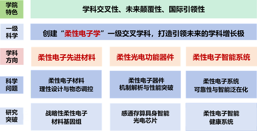 学院在柔性电子先进材料、柔性光电功能器件和柔性电子智能系统三个学科方向上凝聚重点研究领域,构筑学科研究特色。柔性电子先进材料方向:面向高端芯片等国家重大需求,针对柔性电子材料理性设计与物态调控的重大科学问题,强化柔性电子先进材料的研发,制备无机二维材料等纳米半导体、钙钛矿半导体、有机半导体等先进材料,开发战略性柔性电子材料基因组。柔性光电功能器件方向:面向新一代信息技术等国家重大需求,针对柔性电子器件机制解析与性能突破的重大科学问题,强化柔性光电功能器件的创新攻关,研发微纳信息器件、原位一体化器件、生物电子杂化多功能器件、柔性电子智能健康系统等多功能器件。柔性电子智能系统方向:面向人工智能、智慧医疗、智慧农业等战略方向,针对柔性电子系统可靠性与智能泛在化的重大科学问题,强化柔性电子智能健康系统的研究,开发具身智能、通感一体化、医工农工融合智能系统、柔性电子大模型等,构建材料器件系统全链条协同创新生态。